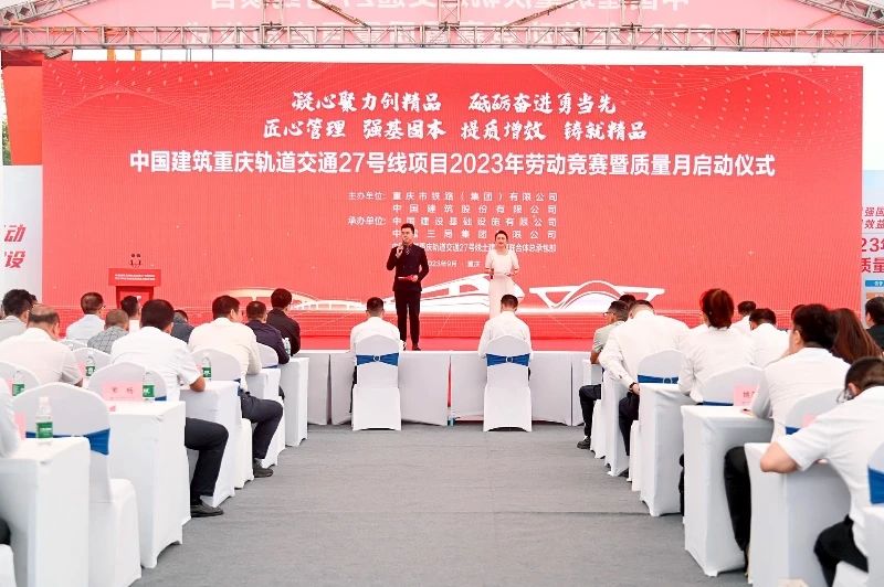 9月25日上午,城轨快线27号线“凝心聚力创精品,砥砺奋进勇当先”劳动竞赛暨质量月启动仪式圆满举行。重庆市住房和城乡建设委员会总工程师袁丁,重庆市交通建设工会副主席周浪,重庆市铁路(集团)有限公司副总经理王靛,中建基础(基础部)重庆公司党总支副书记、执行董事杜永强等出席仪式。