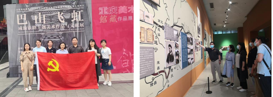 活动简介:6月8日下午,集团审法财务党支部在集团监事会主席、工会主席陈静和财务总监马明泽的带领下,来到重庆美术馆开展“喜迎二十大,感受成渝铁路建设发展”主题党日活动。活动成效:活动中,一行人仔细参观了“巴山飞虹——成渝铁路主题美术作品与文献展”,展览共展出了“速度成渝铁路”主题美术作品和文献资料100余件,涵盖连环画、摄影、油画、雕塑等多种形式,全面展示了七十年来“成渝铁路”主题创作的历史变迁。参观结束后,大家纷纷表示,对历史最好的致敬就是书写新的历史,将立足岗位职责,认真做好各项本职工作,为推动都市快线事业高质量发展作出应有贡献。